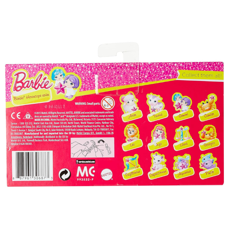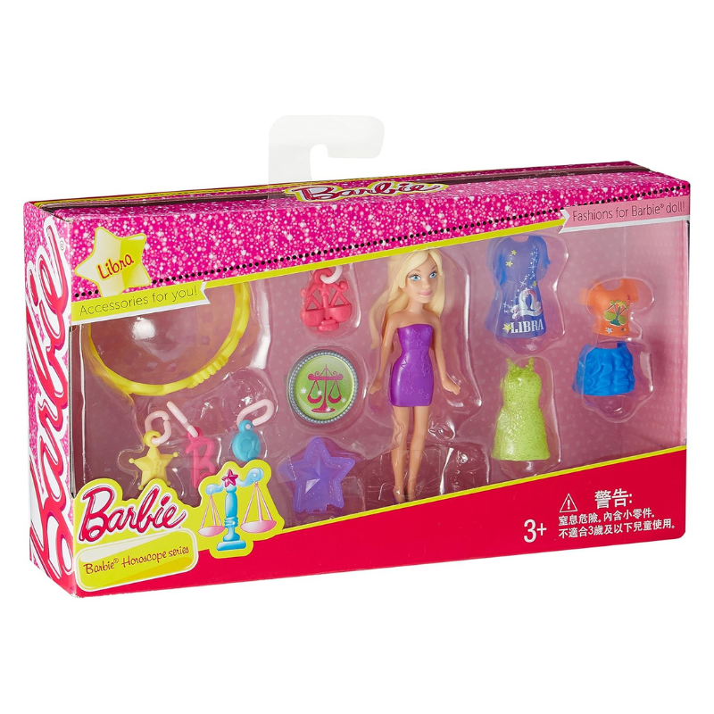 It’s a sign. Girls can learn about horoscopes as well as how to mix and match fashions with these fabulous Barbie fashion packs. Themed to a specific horoscope sign all are represented each set features one adorable Barbie mini doll wearing a brightly colored fashion and shoes, three additional looks, a doll stand and a collection of child sized jewelry: A color matching star shaped ring, a ring displaying the horoscope sign’s symbol, a matching necklace charm and a charm bracelet with three signature style charms and clips a star, a Barbie b and a cool clock. Snap them on and wear one, two or all three. Girls can learn to accessorize themselves while exploring style with Barbie. And they can expand their options and the fun by collecting them all. The mini doll’s fashions snap on and off easily, too. The extra doll clothing includes a top and bottom set and two casual dresses themed to the horoscope sign with graphics or color. Hues are bright and silhouettes trendy. Girls will love exploring their signs and expressing their styles with these versatile fashion packs. Collect all of the Barbie horoscope mini dolls and fashion packs to learn about the entire horoscope and for mix and match fashion fun each sold separately, subject to availability.